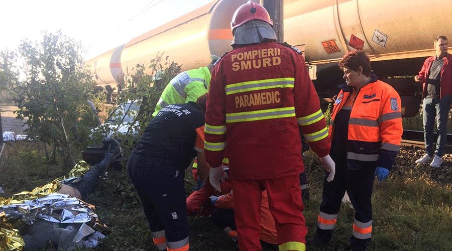 Ambulanță în misiune, lovită de tren, lângă Timișoara! Patru persoane au ajuns la spital