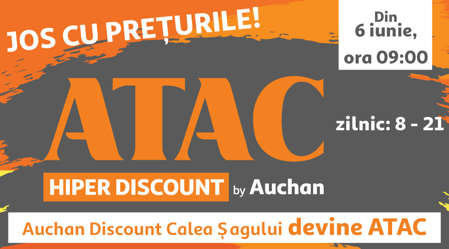Joi, 6 iunie, la ora 09:00, are loc marea deschidere a ATAC Hiper Discount (în locul Auchan Discount Calea Șagului). În noul magazin vei găsi o gamă de peste 17.000 de produse atent selecționate, atât produse proaspete, cât și de băcănie, detergenți și produse de curățenie, produse cosmetice și de îngrijire, băuturi alcoolice, răcoritoare și multe altele. Conceptul de hiper discount răspunde puterii de cumpărare a românilor, oferindu-ți un sortiment variat format din 60% produse alimentare și 40% nealimentare, la cel mai bun raport calitate-preț, produse fabricate în România și nu numai.