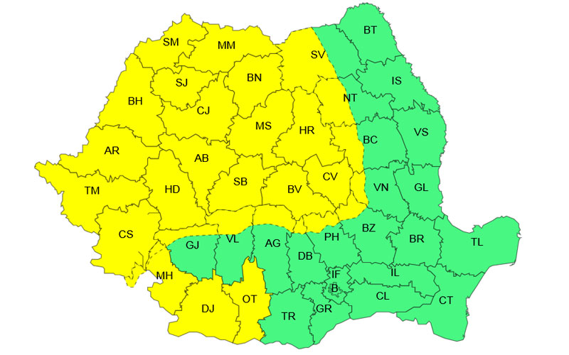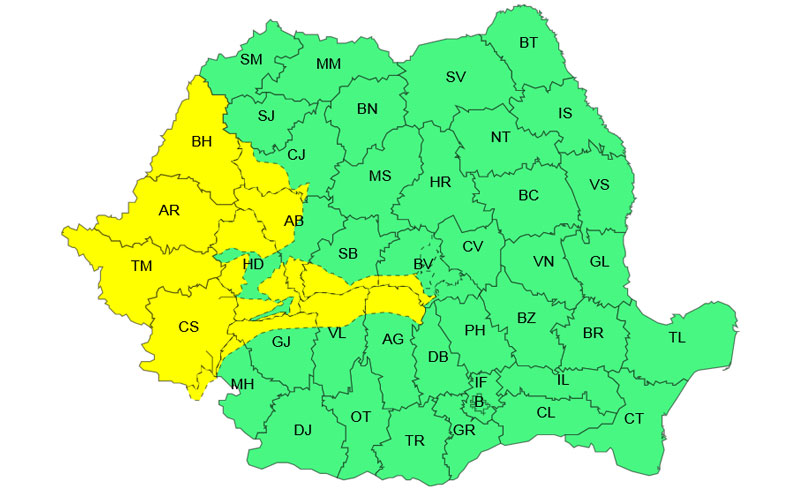 Cea de-a doua avertizare cod galben va fi valabilă mâine, între orele 10:00 și 21:00. Sunt vizate Banatul, Crișana, Maramureșul, Transilvania, precum și vestul și sudul Olteniei, dar și zona montană.