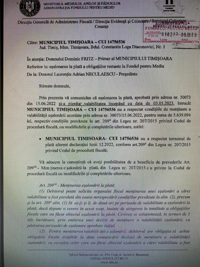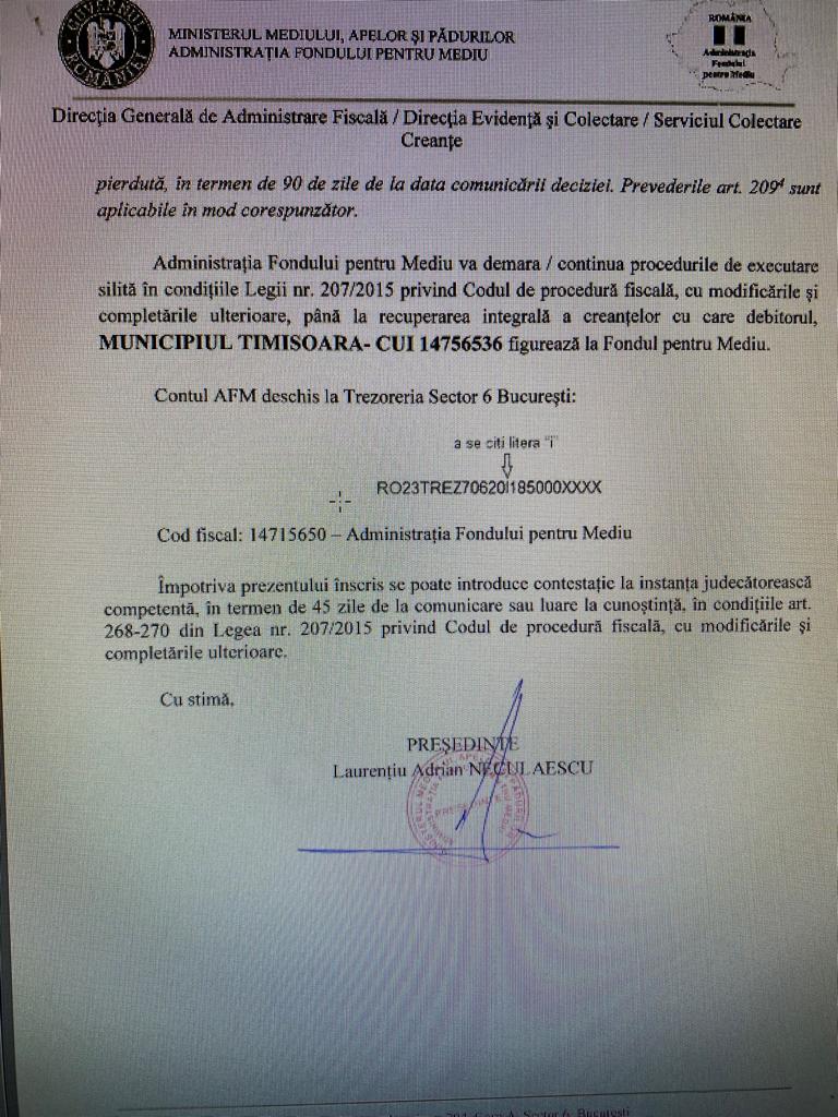 “Municipiul Timişoara – CUI 147565336 nu a respectat termenul de plată aferent declaraţiei lunii 12.2022, conform art. 209 din Legea nr. 207/2015 privind Codul de procedură fiscală (…) Administraia Fondului de Mediu va demara/continua procedurile de executare silită, în condiţiile Legii nr. 207/2015 privind Codul de procedură fiscală, cu modificările şi completările ulterioare, până la recuperarea integrală a creanţelor cu care debitorul figurează la Fondul pentru Mediu”, se arată în documentul trimis de AFM, Primăriei Timişoara.