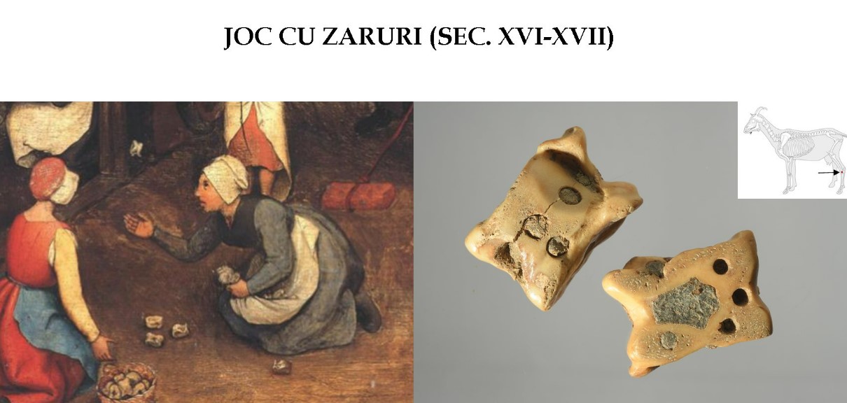 Piesele din imagine au fost folosite ca zaruri și datează din perioada stăpânirii otomane (1552-1716). Zarurile au fost descoperite în anul 2012 cu ocazia săpăturilor arheologice efectuate în curtea Castelului Huniade. Ele au aparținut soldaților care aveau ca sarcină apărarea fortificației, și nu este exclusă posibilitatea ca ei să le fi confecționat, alături de piesele din imagine fiind găsite și altele neprelucrate. Oasele au fost perforate, iar găurile de pe cele patru fețe ale pieselor au fost umplute cu plumb, obținându-se astfel diferite combinații de puncte.