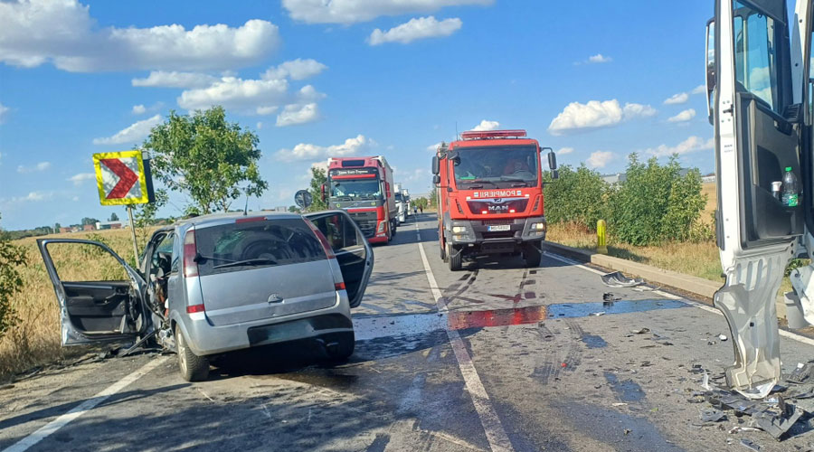Impact violent, în urmă cu puțin timp, când o mașină și un camion s-au ciocnit violent, iar o femeie de 50 de ani a rămas blocată în autoturismu distrus.