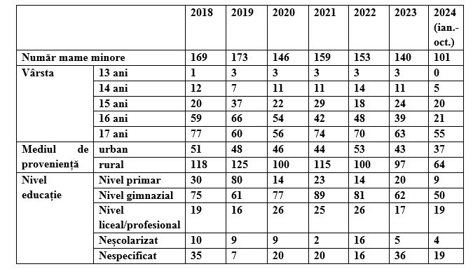 În anul 2021, în evidențele DGASPC Timiș au fost 159 de mame minore, în 2022 – 153 de mame minore, în 2023 – 140 de tinere, iar în 2024, de la începutul anului şi pȃnă la începutul lunii octombrie – 101 mame minore.