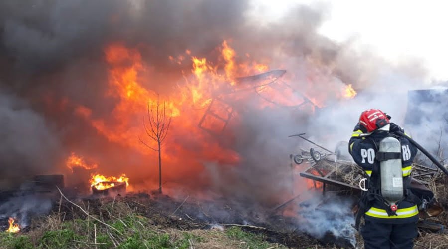 Focul se manifestă generalizat, la o fermă de pe raza județului Arad, în apropiere de localitatea Variașu Mare.