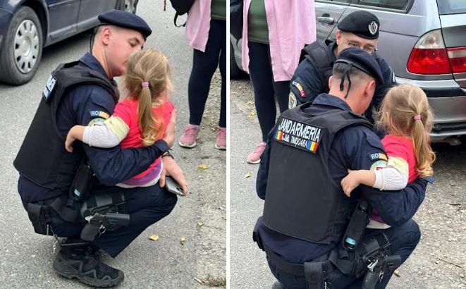 Fetiță de trei ani, singură și speriată, găsită pe stradă, de un echipaj de jandarmi! Copila a ajuns în brațele mamei