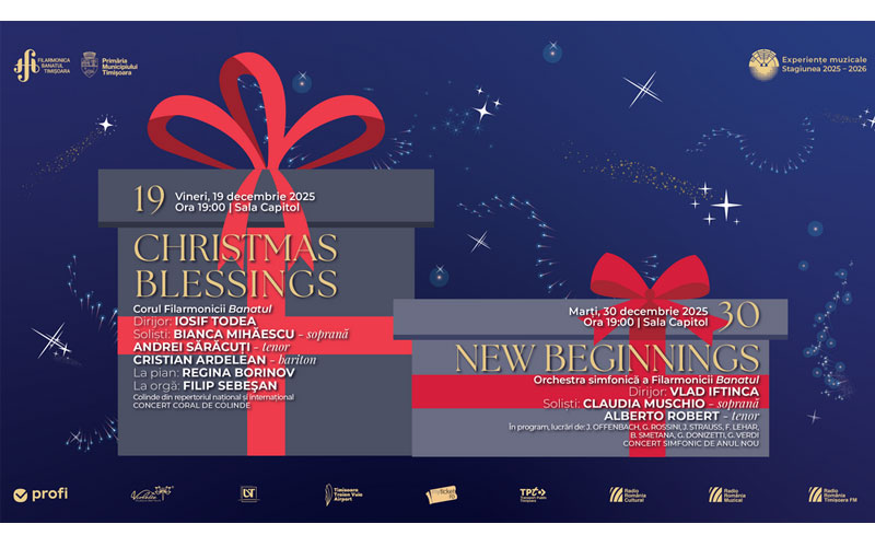Filarmonica Banatul Timișoara încheie anul 2025 cu două evenimente dedicate bucuriei, renașterii prin muzică și speranței: concertul coral de colinde Christmas Blessings, din 19 decembrie, și concertul simfonic de Anul Nou New Beginnings, din 30 decembrie.