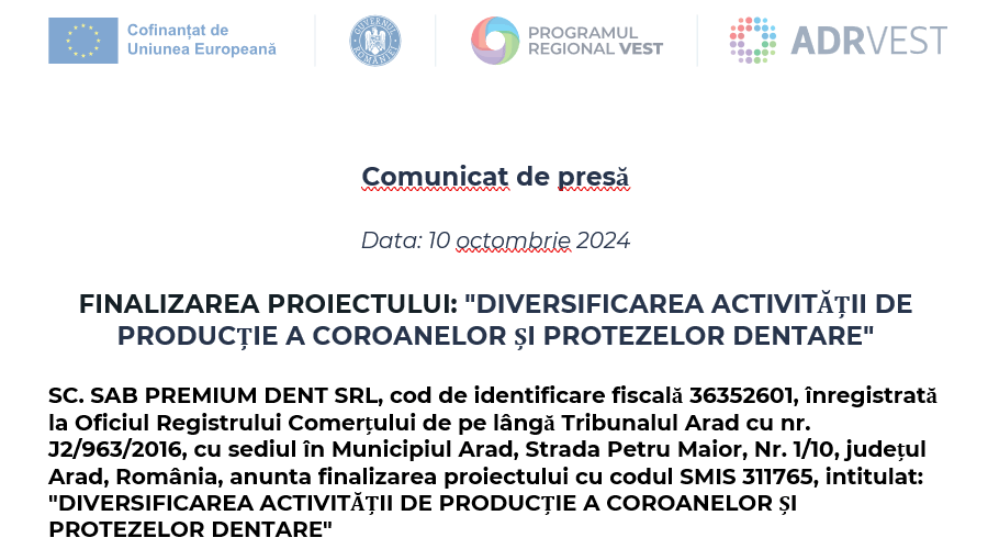 SC. SAB PREMIUM DENT SRL, cod de identificare fiscală 36352601, înregistrată la Oficiul Registrului Comerțului de pe lângă Tribunalul Arad cu nr. J2/963/2016, cu sediul în Municipiul Arad, Strada Petru Maior, Nr. 1/10, județul Arad, România, anunta finalizarea proiectului cu codul SMIS 311765, intitulat: „DIVERSIFICAREA ACTIVITĂȚII DE PRODUCȚIE A COROANELOR ȘI PROTEZELOR DENTARE”, cofinanţat din Fondul European de Dezvoltare Regională, prin Programul Regional Vest 2021-2027, în baza Contractului de finanţare încheiat cu Agenția pentru Dezvoltare Regională a Regiunii Vest, în calitate de Autoritate de Management pentru Programul Regional Vest 2021-2027, în data de 26.03.2024.