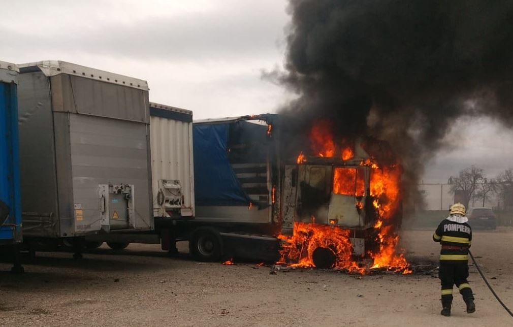 „Flăcările au La ora 12.47, în dispeceratul ISU Crișana a fost primit un apel care sesiza izbucnirea unui incendiu la un autocamion parcat în curtea unei societăți comerciale de pe strada Matei Corvin din municipiul Oradea, la fața locului deplasându-se de urgență, echipajele Detașamentului 2 de Pompieri Oradea, cu două autospeciale de stingere. Incendiul, care se manifesta violent și generalizat la un cap tractor și parțial la prelata de pe remorca autocamionului, a fost localizat și lichidat operativ, pompierii salvând remorca autovehiculului și alte trei remorci aflate în apropiere”, transmite ISU Bihor.
