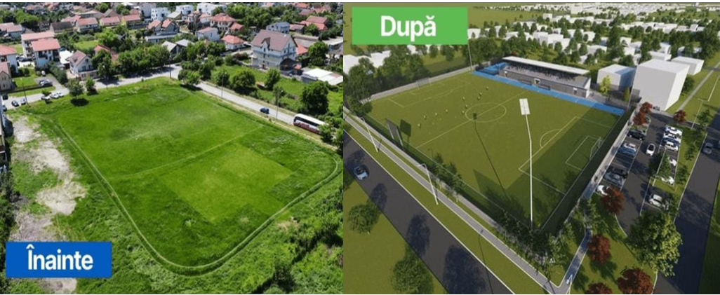 Proiectul bazei sportive prevede amenajarea unui teren de fotbal, cu o suprafaţă sintetică şi dimensiuni conform reglementarilor FIFA, care va fi dotat cu o tabelă de marcaj.