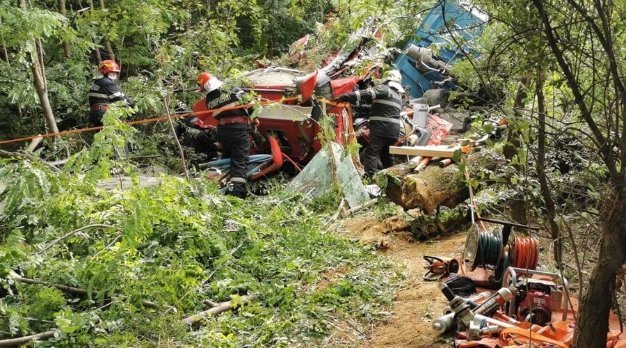 În momentul în care a părăsit partea carosabilă, autobasculanta a izbit mai mulți copaci de pe marginea drumului.
