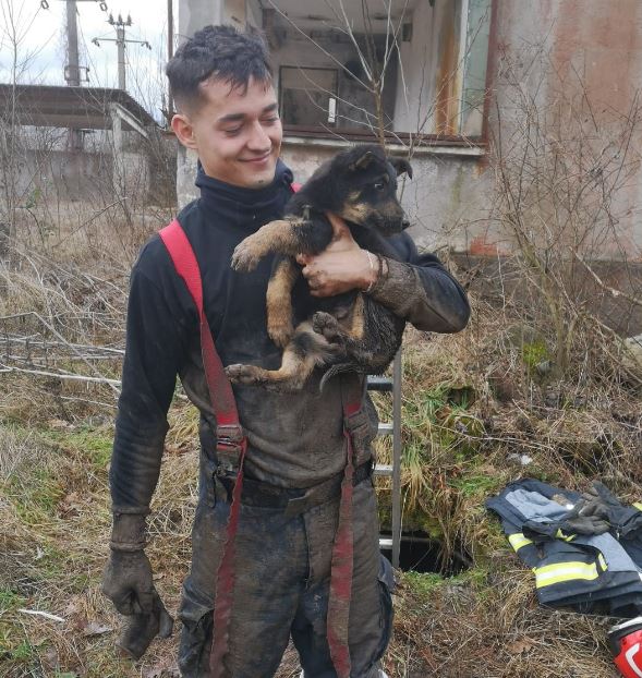 FOTO Cățeluș salvat după ce a căzut într-un bazin dezafectat! Un pompier a intrat într-o conductă îngustă pentru a-l scoate afară