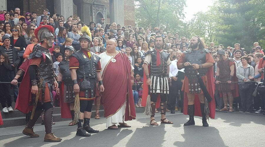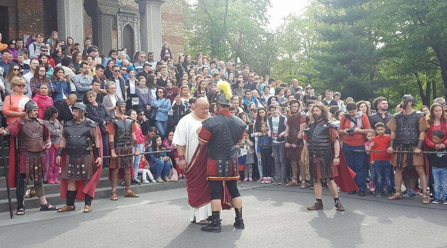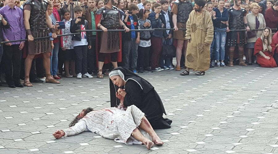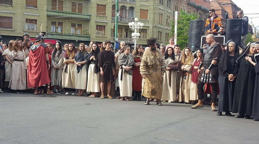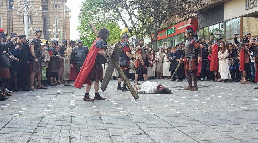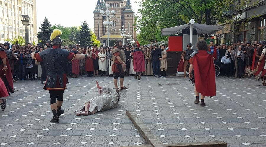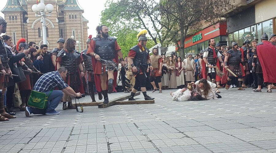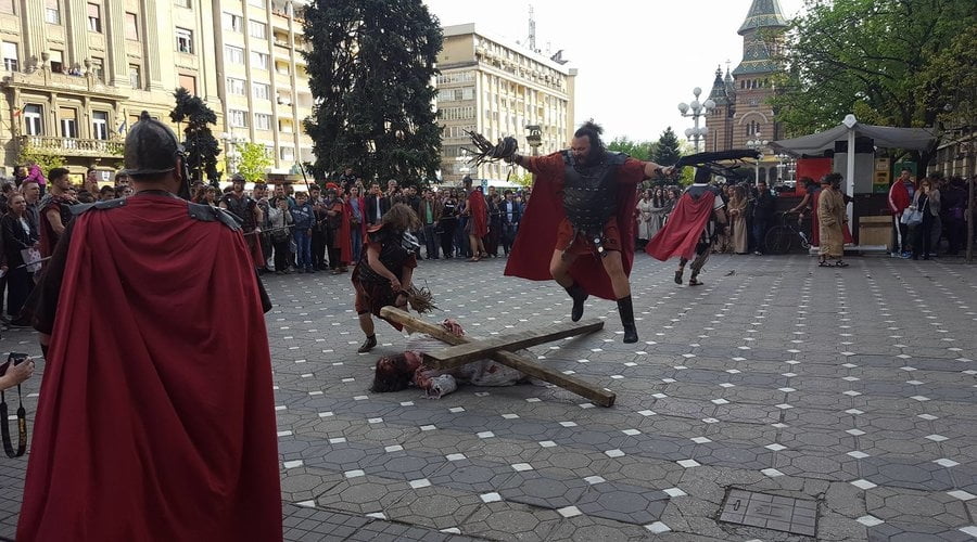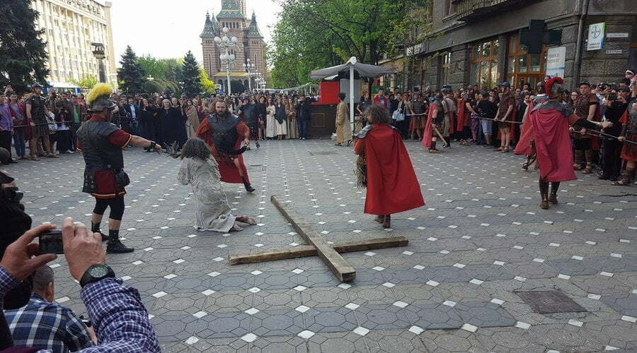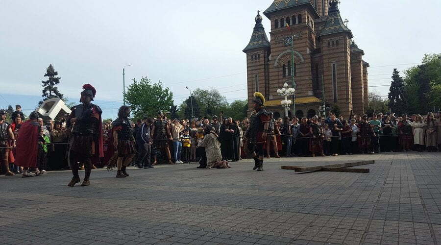 Patimile Mântuitorului sunt reproduse, în această după amiază la Timișoara, de actori amatori care au dat viață unor personaje istorice precum Iisus Hristos, soldaţii romani, Pilat din Pont, Baraba, Maria – mama lui Isus, sau mironosiţele.