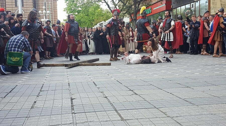Sceneta a început în fața Catedralei mitropolitate, iar prin centrul orașului va urma un drum al patimilor, care se va încheia în Piaţa Unirii, unde va fi recreată scena crucificării.