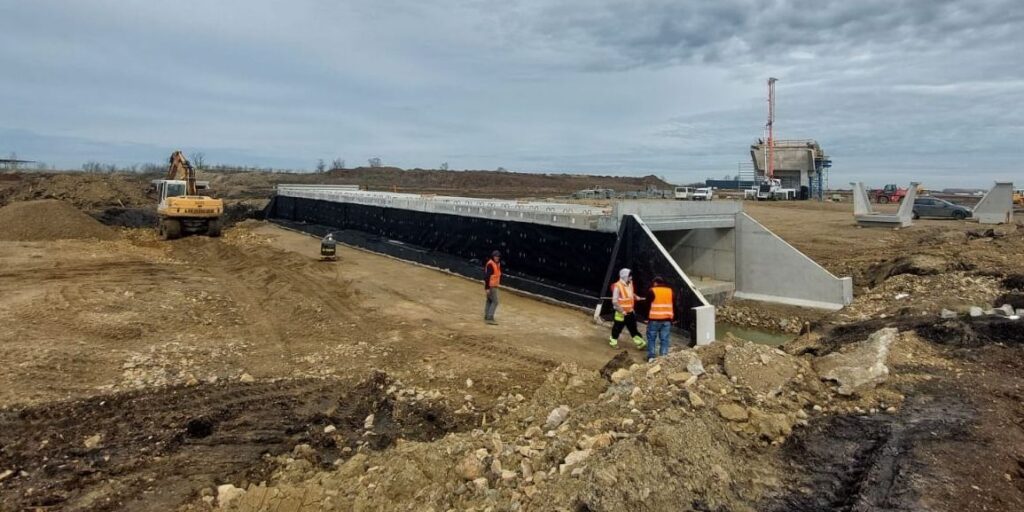 Se lucrează și la șanțuri și rigole, la asigurarea scurgerii apelor și bazine de retenție. Stadiul șantierului este de aproape 47%.