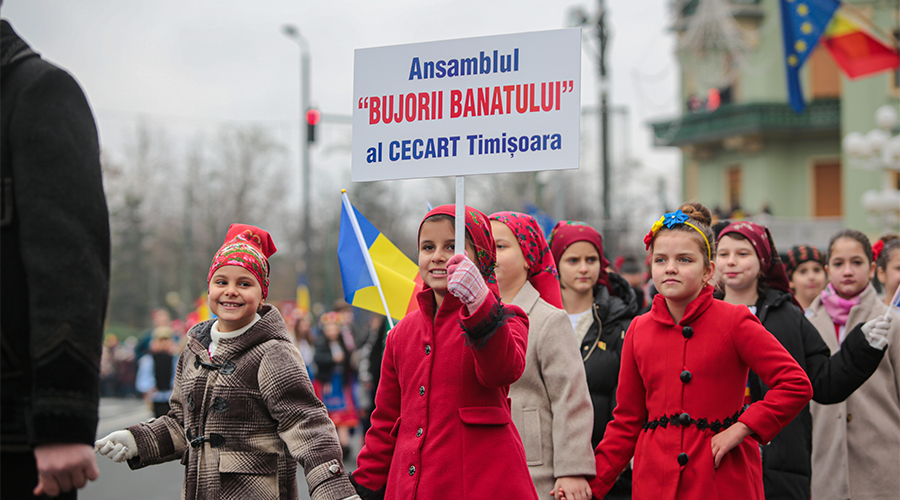 Mii de timișoreni s-au adunat pentru a admira evenimentul, în cadrul căruia s-au alăturat mai mulți copii cu steaguri în mână, pentru a celebra sărbătoarea Marii Uniri.