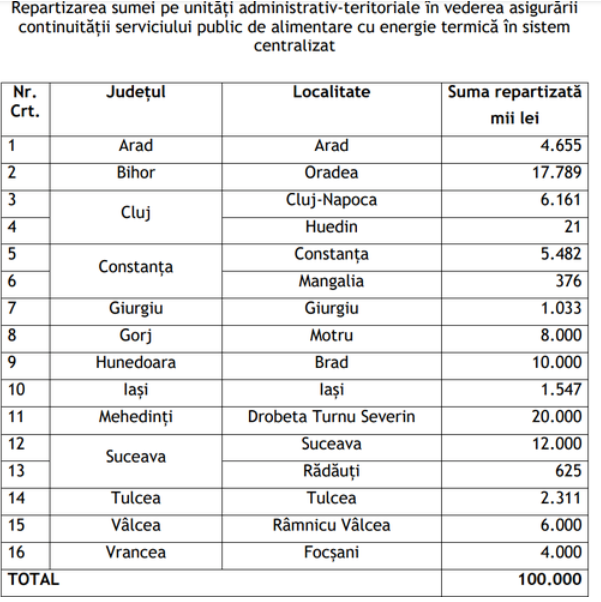 Cele mai mari sume sunt merg către Drobeta Turnu-Severin (20 de milioane de lei), Oradea (17,8 milioane de lei), Suceava (12 milioane de lei) și Brad, județul Hunedoara (10 milioane de lei).