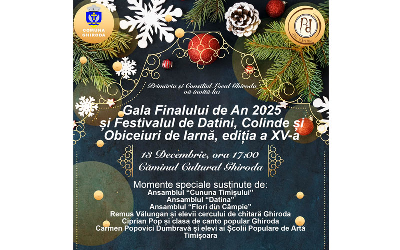 Este vorba despre Gala Finalului de An și Festivalul de Datini, Colinde și Obiceiuri de Iarnă, ajuns la cea de-a XV-a ediție, care se va desfășura sâmbătă, la Căminul Cultural din localitate, începând cu ora 17:00.