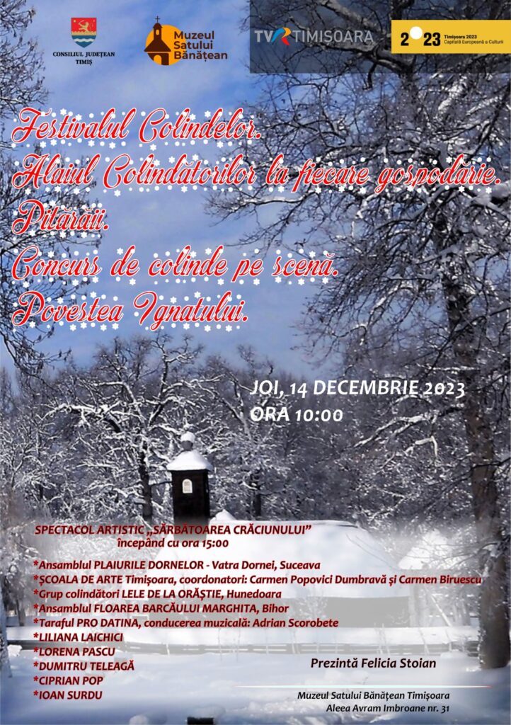 Timișorenii sunt așteptați joi să participați evenimentele prilejuite de ”Festivalul Colindelor”, ”Alaiul Colindătorilor la fiecare gospodărie”, ”Pițărăii”, ”Concurs de colinde pe scenă” și ”Povestea Ignatului”.
