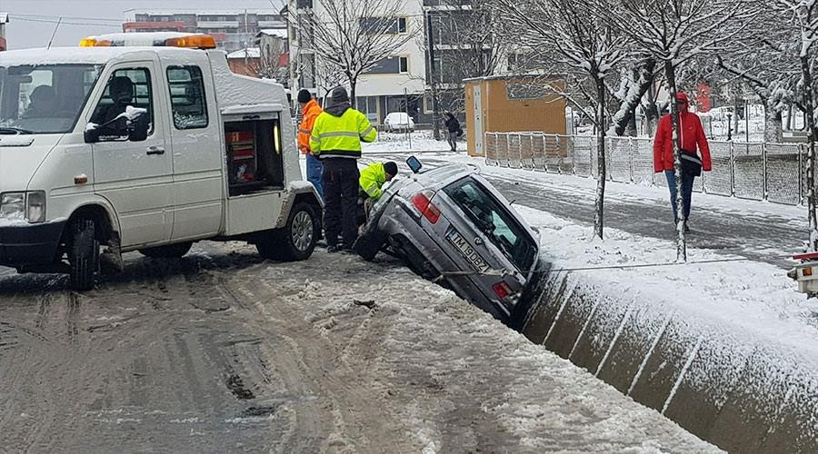 La intrare în Timișoara, dinspre Giroc, o mașină a ajuns pe marginea drumului, în șanț, după ce a derapat din cauza poleiului.
