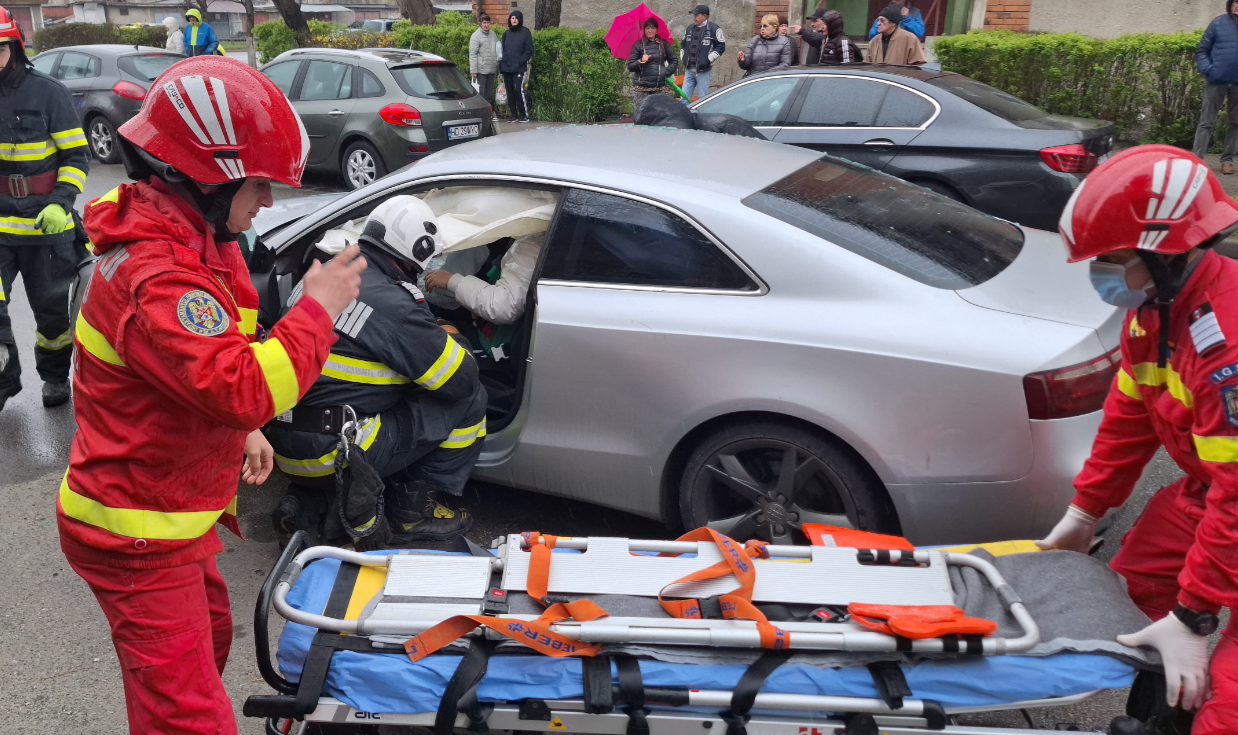 Impact puternic între două mașini! O femeie a rămas încarcerată