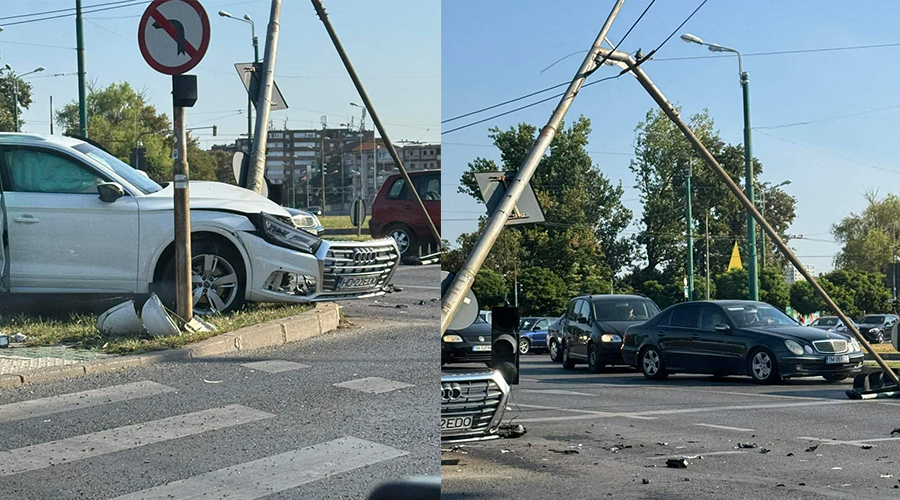 O șoferiță care circula dinspre strada Corneliu Coposu înspre bulevardul Vasile Pârvan, nu s-a asigurat la schimbarea benzii de circulație și a fost lovită de autoturismul care se afla în paralel. În urma impactului, mașina femeii a fost proiectată într-un semafor, pe care l-a și dărâmat.