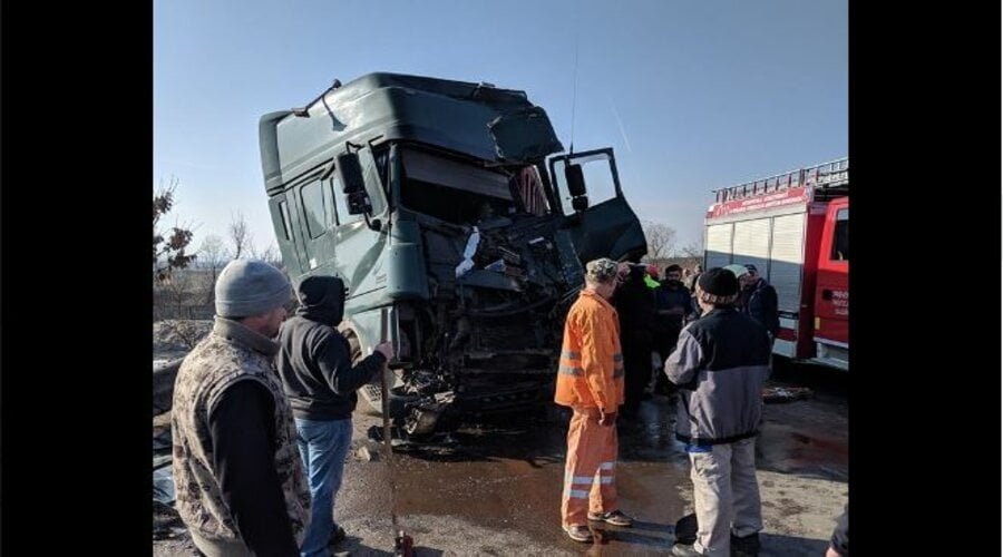 Două tiruri s-au izbit violent. Unul dintre șoferi nu a păstrat distanța regulamentară față de autocamionul din față, pe care l-a izbit extrem de violent. Cabina tirului fiind complet distrusă.