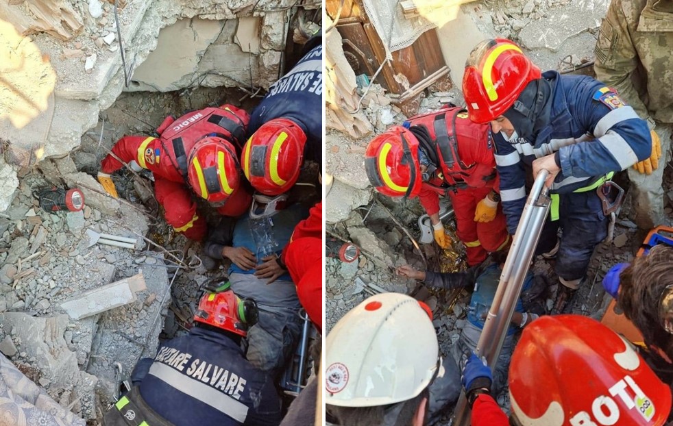 ”În ultimele 12 ore, cel de al doilea modul mobilizat în Republica Turcia, format din echipa de căutare-salvare RO-USAR, medici și asistenți SMURD și echipaj cu personal canin specializat în căutare-salvare au acționat pentru extragerea și salvarea unei persoane de sex masculin, surprinsă pe casa scării, o clădire de 6 etaje, prăbușită complet. Pentru această misiune dificilă s-au utilizat echipamentele de salvare aflate în dotarea pompierilor salvatori RO-USAR, activitatea fiind sub coordonare medicală”, transmite DSU.