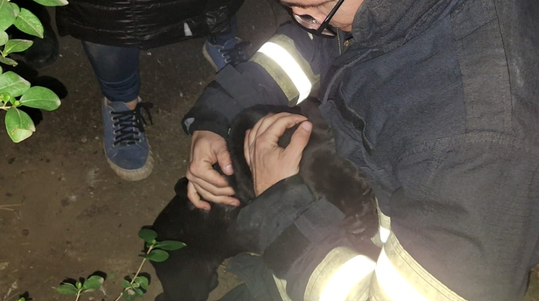 La scurt timp, la fața locului, a ajuns un echipaj de pompieri, reușind să elibereze cățelul, care a ajuns în siguranță înapoi în brațele stăpânei.