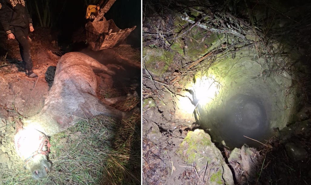 Operațiunea de salvare a avut loc în localitatea Miheleu, din județul Bihor. Un pompier a coborât în fântână pentru a asigura animalul, care abia mai respira. Cu ajutorul chingilor și al unui buldoexcavator a fost scos în viață.