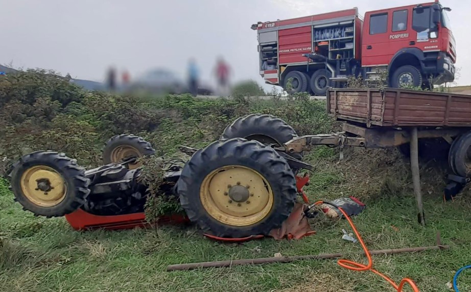 Intervenție dificilă a pompierilor! Un tânăr a fost prins sub un tractor care s-a răsturnat. A fost solicitat și elicopterul SMURD