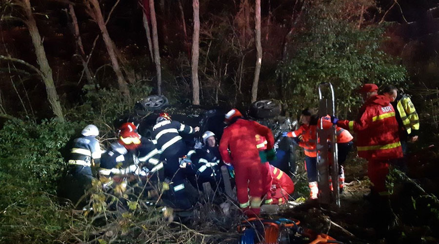 Intervenție dramatică, în miez de noapte! Patru victime, după ce o mașină s-a prăbușit într-o râpă