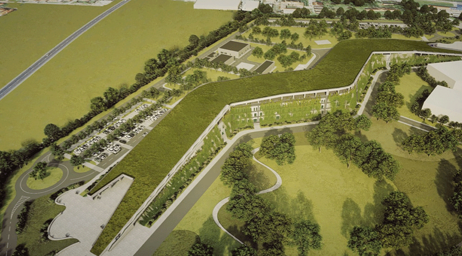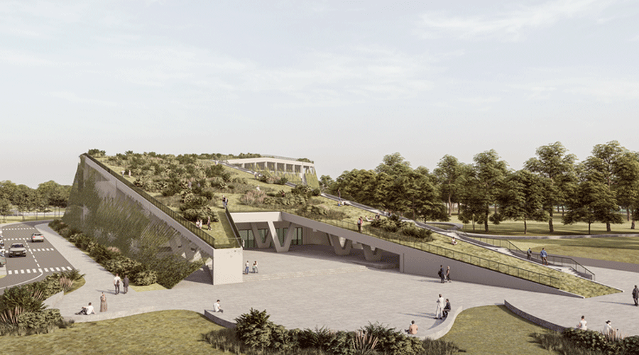 Proiectul propune un concept arhitectural care modelează terenul într-un acoperiș verde accesibil publicului, transformând spitalul într-o extensie firească a peisajului.