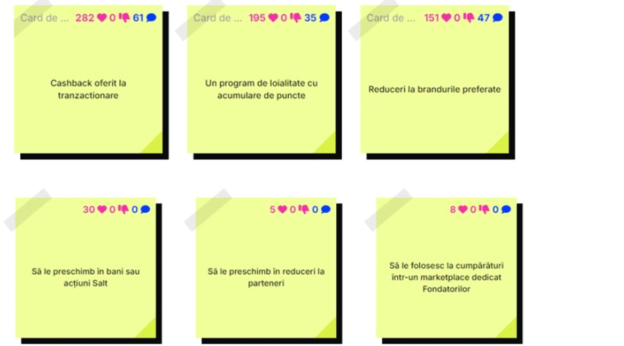 Salt Bank a lansat un model unic pe piața bancară din România, prin care toți cei care s-au înrolat în Comunitatea Fondatorilor primesc un set de beneficii speciale. Unul dintre cele mai interesante este că pot influența viitorul băncii – iar cei 100.000 de fondatori au și făcut-o deja. Salt Bank a strâns până în prezent peste 6.000 de idei și feedbackuri venite din partea celor 4.000 de membri ai Comunității Fondatorilor Salt. Prin participarea activă în comunitate, fondatorii influențează direct viitorul Salt.