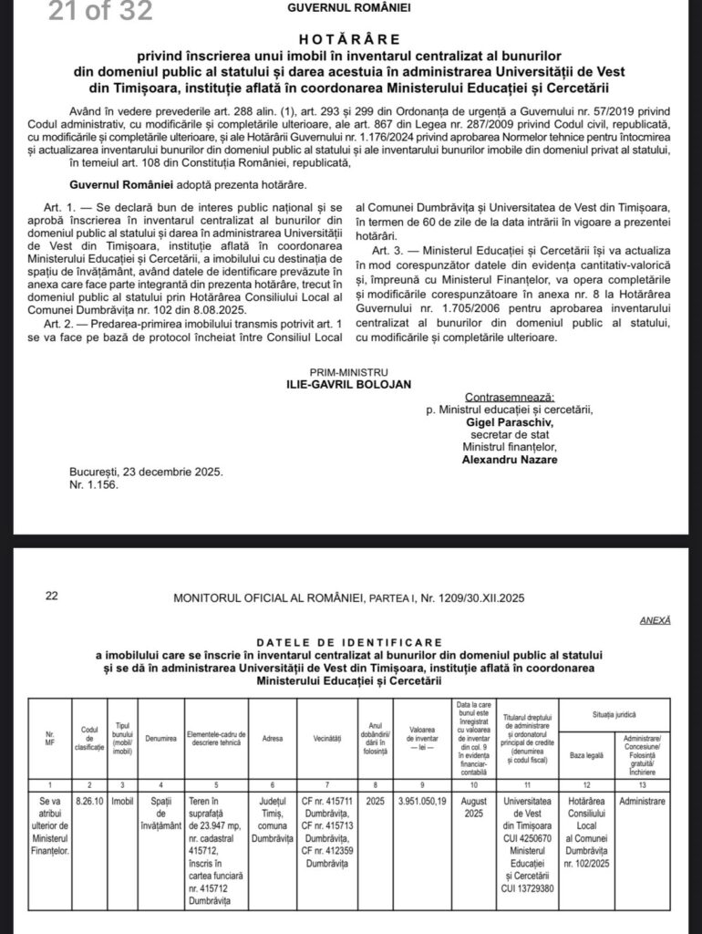 „Această Hotărâre de Guvern reprezintă un rezultat concret al colaborării instituționale dintre Universitatea de Vest din Timișoara și administrația publică locală din Dumbrăvița. Este un pas strategic pentru dezvoltarea infrastructurii educaționale și pentru extinderea misiunii UVT în zona metropolitană Timișoara, în beneficiul comunității și al sistemului educațional regional”, a declarat Marilen Pirtea, rectorul Universității de Vest din Timișoara.