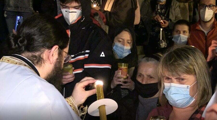 Acolo, între orele 12:30 şi 14:30, deasupra Sfântului Mormânt un foc se pogoară din cer şi în primele minute nu frige.