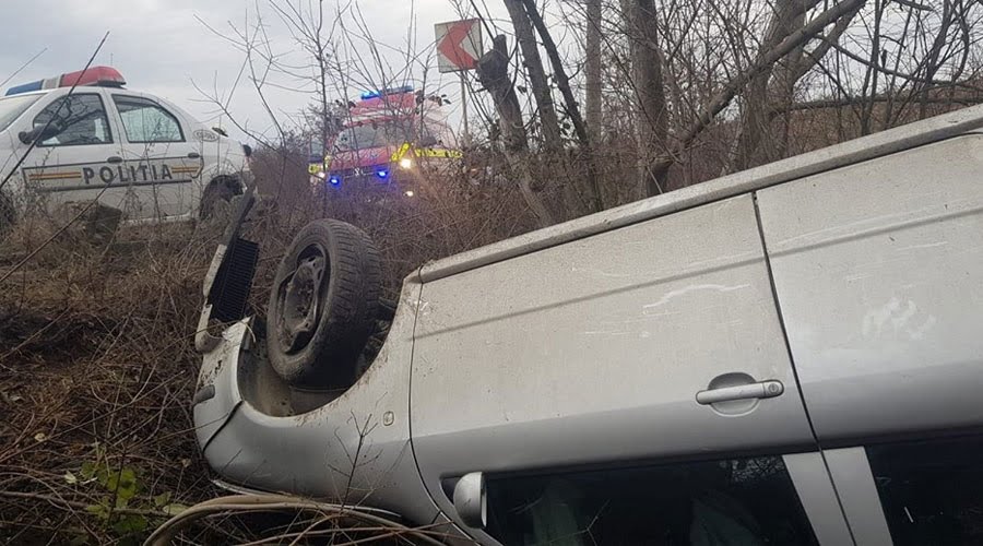 Mamă, tată şi copil, accidentaţi! Maşina în care erau s-a răsturnat cu roţile în sus