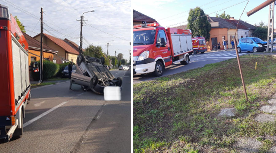 Mașină cu roțile-n sus, pe mijlocul drumului, după un impact violent! Celălalt autoturism implicat în accident a fost proiectat într-un stâlp
