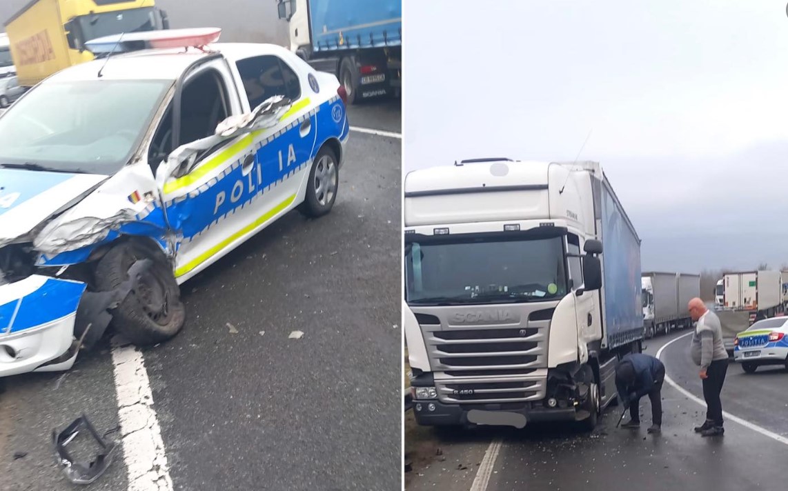 Mașină de poliție, în misiune, implicată într-un accident, pe DN 6! A fost lovită de un tir