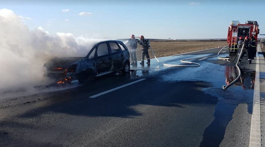 Șoferul a văzut că iese fum de sub capotă, a oprit imediat și s-a dat jos. În scurt timp însă, mașina a fost cuprinsă de flăcări în totalitate.
