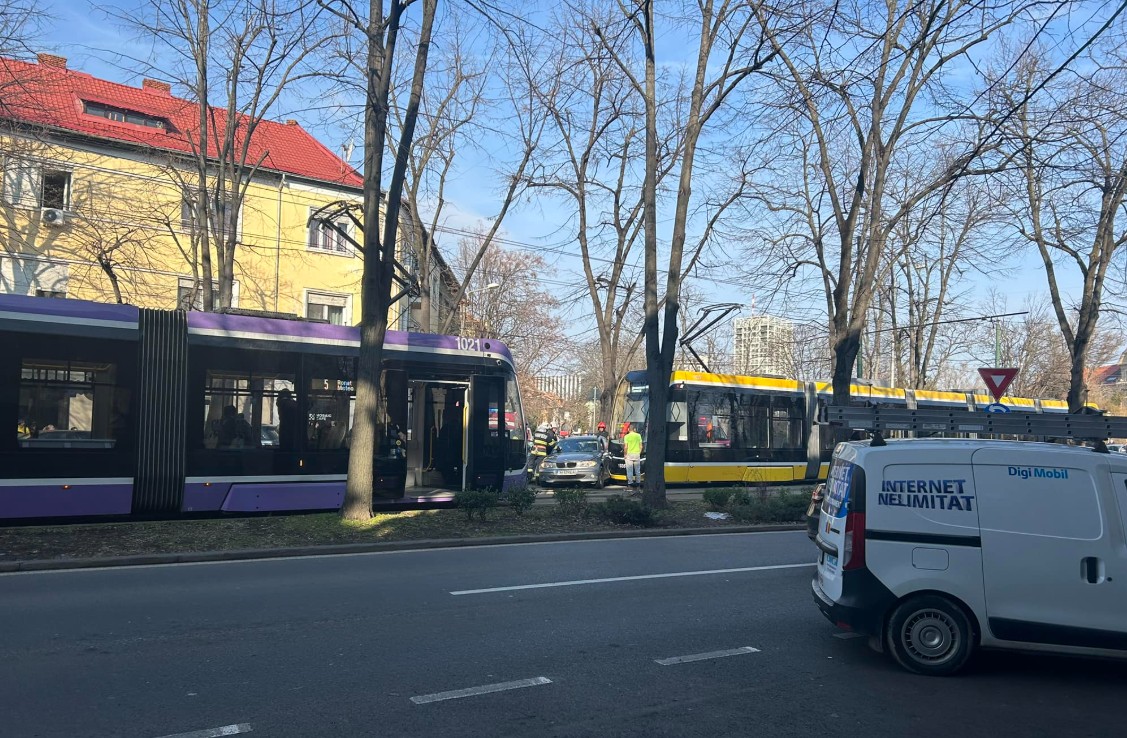 ”În jurul orei 14.30, am fost solicitați să intervenim pentru asigurarea măsurilor PSI și prim ajutor în urma unui accident rutier produs în Timisoara, pe Bd. Revoluției. La fața locului s-au deplasat pompierii din cadrul Detașamentului 1 cu o autospecială de primă intervenție si comandă, o autospecială de descarcerare și un echipaj SMURD. În accidentul rutier au fost implicate un autoturism și un tramvai. În urma evenimentului, conducătorul autoturismului a rămas blocat”, transmite ISU Timiș.