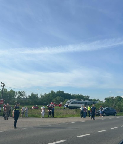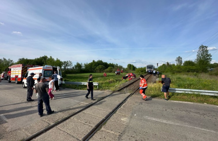 Mașină lovită de tren, în Timiș! Două victime au rămas încarcerate și sunt în stare gravă! A fost solicitat și elicopterul SMURD!