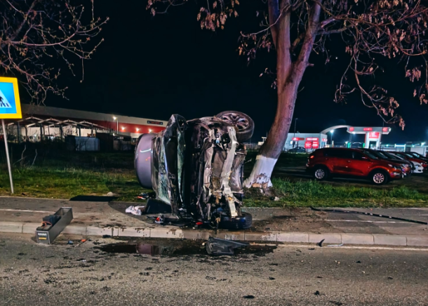 Accident grav de circulație, azi-noapte. O mașină s-a răsturnat pe trotuar.