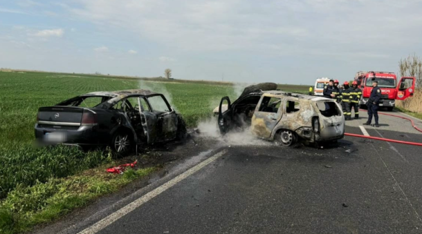 VIDEO: Impact violent între două mașini, urmat de un incendiu, în ajunul Paștelui! La fața locului intervine un elicopter SMURD UPDATE O victimă a murit