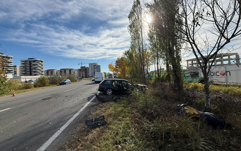 Accident la ieșire din Timișoara. Au fost implicate o mașină și o motocicletă.