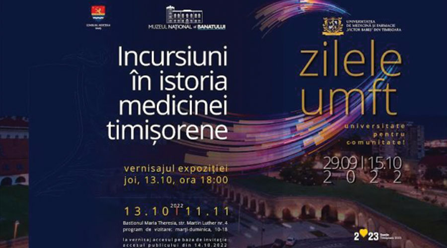 Vernisajul expoziției „Incursiuni în istoria medicinei timișorene” are loc joi, 13 octombrie, de la ora 18.00, în holul Bastionului Theresia, strada Martin Luther, nr. 4. Participarea la vernisaj se face exclusiv pe bază de invitație. Vizitarea expoziției, începând cu 14 octombrie, este gratuită.