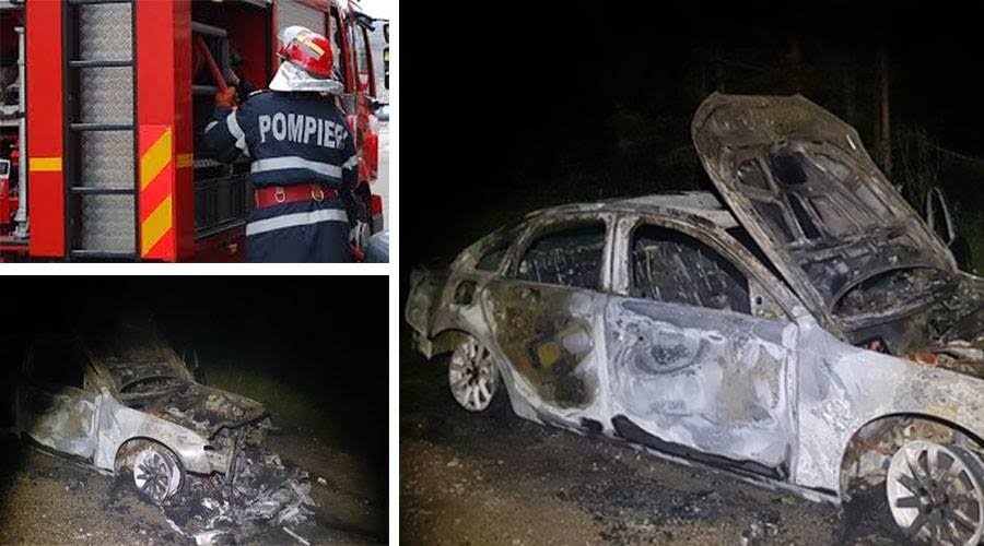În urma incendiului, mașina a fost făcută scrum. Totul s-ar fi întâmplat din cauza unui scurtcircuit electric.