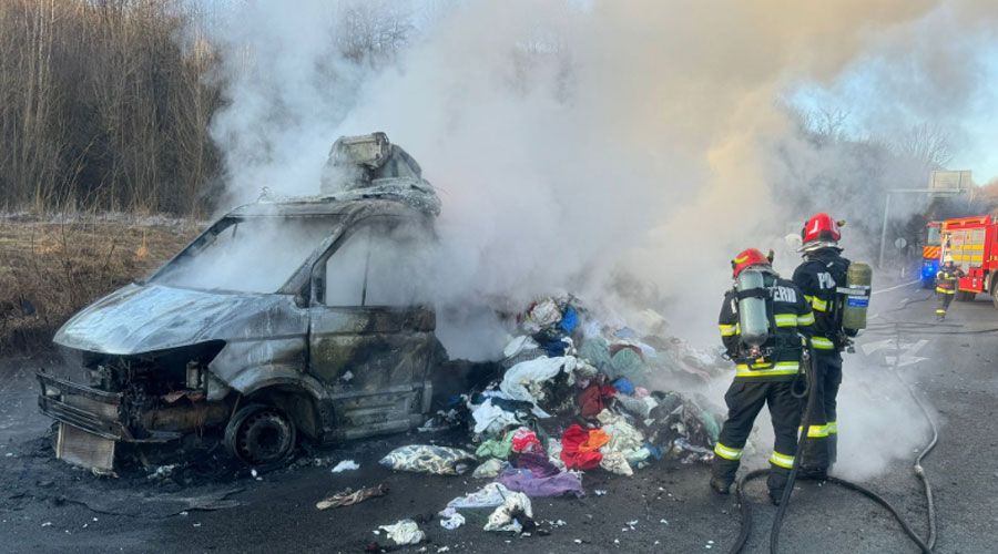 Pompierii au fost chemaţi de urgenţă, în această dimineaţă, să lichideze incendiul violent care a cuprins o autoutilitară încărcată cu articole textile.