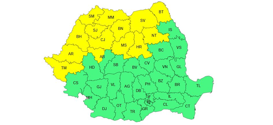 Totodată, în nordul Banatului, adică în județul Timiș, în Crișana, Maramureș, jumătatea de nord a Transilvaniei, nordul Moldovei, vor fi perioade cu instabilitate atmosferică accentuată ce se va manifesta prin averse torențiale, descărcări electrice, intensificări ale vântului, vijelii (rafale în general de 50-70 km/h) și grindină. În intervale scurte de timp sau prin acumulare cantitățile de apă vor fi de 20-30 l/mp și izolat de peste 40 l/mp.