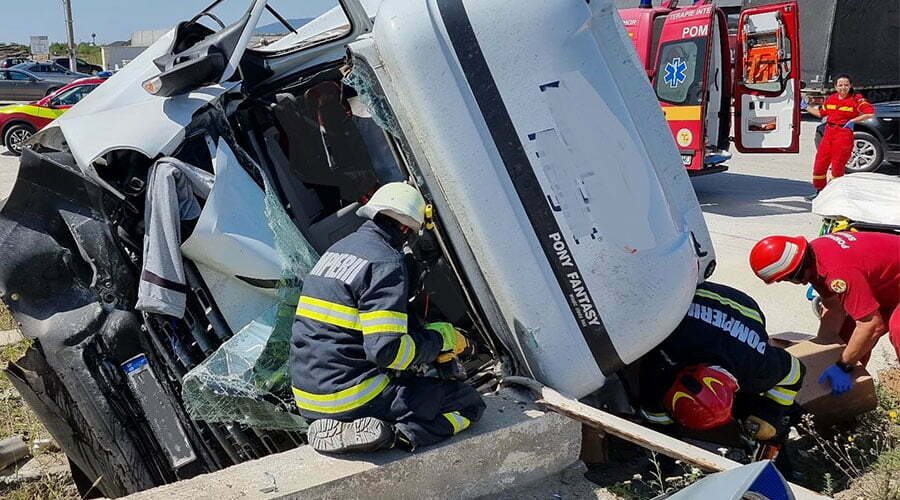 Accident grav, provocat de şoferul unei camionete, care a pierdut controlul asupra direcţiei de mers şi a inntrat cu viteză, într-un cap de pod.