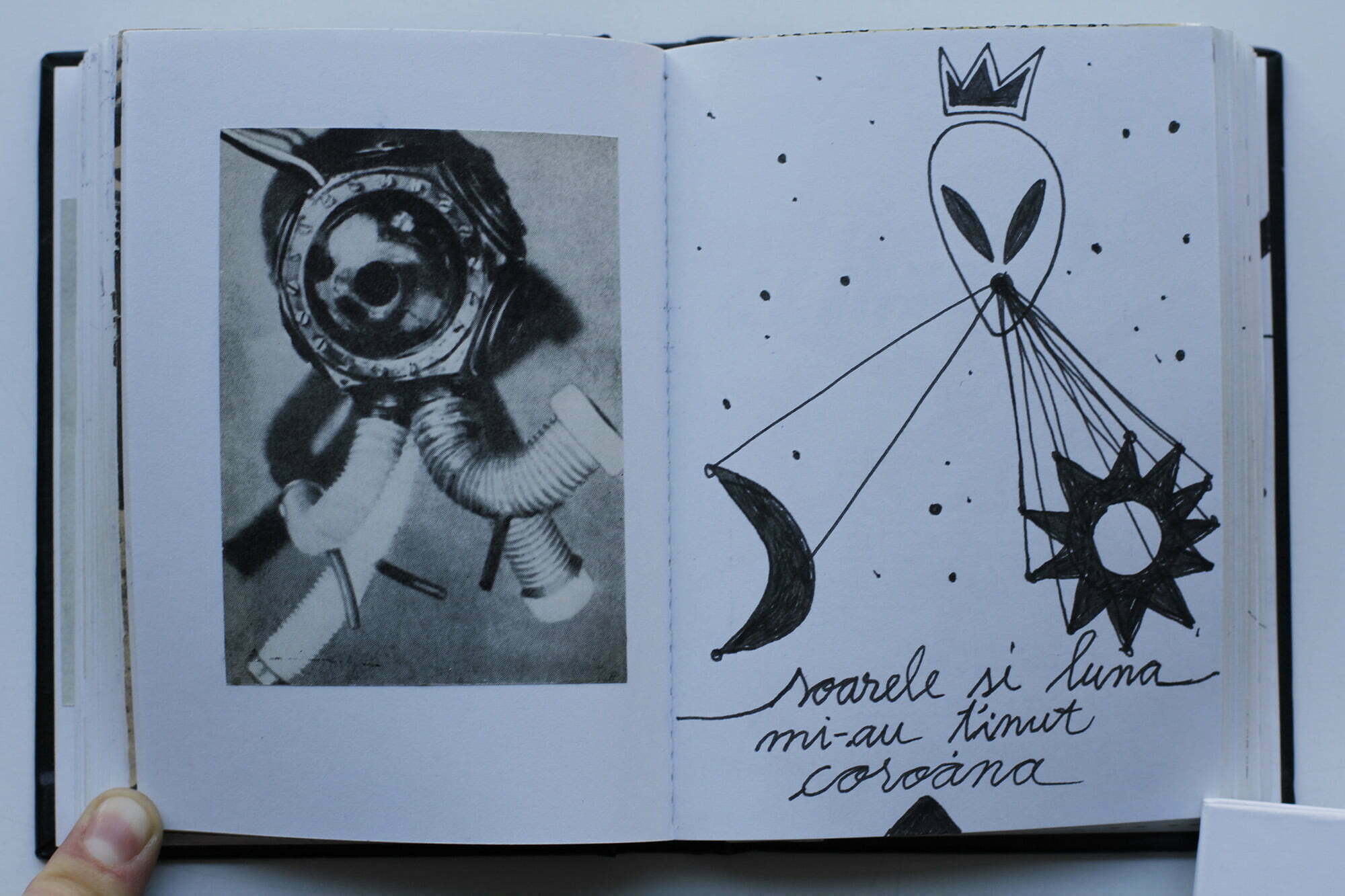 Titlul sugerează acest univers suprapus: pe de o parte trimite la faimosul titlu al volumului de poezie semnat de Tristan Tzara, pe de altă parte, sugerează ambiguitatea personajelor acestor universuri nepământești, omul ALIENat, extraterestrul cu identitate umană aproximativă. Ambele resurse sunt esențiale în creația lui Mihai Zgondoiu: mai întâi, avangarda, utilizată de artist atât ca reper istoric și argument conceptual, dar și ca mecanism (de exemplu, specularea hazardului ca mod de lucru, sau absurdul agrementat cu o bună doză de ironie care învăluie tot demersul). Apoi, e vorba de preocuparea artistului pentru literatura fantastică, pentru „cercetările” populare în zona misterelor, lumilor paralele și paranormale, o mitologie personală asumată sarcastic-serios și instrumentată bogat în această expoziție.